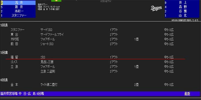 以前話をした立ち退きがいよいよさらに本格的になってきました。 先日、引っ越し資金捻出の宅内調査に来まして、 見積もりは今月末から来月頭にかけて出されるとの事。 とりあえず「今すぐに出ろ」という訳ではなく安心したのですが、 それでも早ければ9月位になるそうで、のんびりもしていられない状況です。 (3ヶ月なんてあっという間です) 前回のコラムを受けて皆様から叱咤激励されたこともあり、 当社比1.5倍くらいの気合を入れて部屋を片付けております。 でも、やっぱり見つかるんですねえ、色々な物が。 とは言っても、今回のは会社のパソコンにあったものです。 部屋を片付け始めると会社の方も気になり始めて整理してたら出てきました。 私の毎日の残業に欠かせない御供は、 夜食でも飲み物でも御菓子でも音楽でも時坂樹でも牧野那波でも桂木弥生でも星野みずきでもなく、 インターネット上で見れる中日ドラゴンズオフィシャルサイトの野球速報になります。 (最後の4つはあったら是非欲しいんですけど) まあ、アフターファイブだからこそできる技ですね。 このくらいやらないと仕事やってられません。 当然、勝ってると仕事の能率は上がります。 で、勝ってても負けてても見たら終わりというのが普通なのですが、 とある日だけ奇妙なモノを発見して思わず画面をキャプチャしていました。 その画像が見つかったんですね。 ![]() ゴロだけだと語呂が良かったので(失礼)何となくキャプチャしていたのですが、 改めて見てみると、なんかマヌケです。 結局、何処に打ったんでしょうねえ。 野球に興味の無い方、またまた申し訳御座いませんでした。 というか、部屋片付けと全然関係無いぞ。片付けという点では共通してますけど。 |