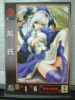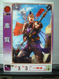 写真は現在アーケードで好評稼動中の『三国志大戦』で使用するカードです。 少々見難いかもしれませんが、高覧は袁紹軍に所属のコスト1・武力3・知力3の槍部隊で 「一番槍」という自身の武力を上昇させる・・・ って、おい高覧! ![]() その股間は何だ!! これじゃあ凛々しい面構えも台無しじゃないか。 真面目に考えれば俗に言う「ファウルカップ」みたいなものだと思うのですが、 この三国志大戦というゲームは女性部将も存在するため、それよりも