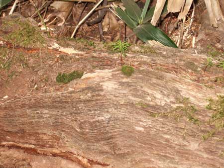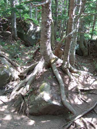 小さくて見難いかもしれませんが、倒れた木の上に新しい稚樹が生えています。 朽ち果てた木と言えども湿り気と養分は含まれているため、こうやって稚樹が生長するのだそうです。 この現象を倒木更新と呼ぶそうで。 朽ち果てて倒れてしまったものの上に新しい息吹が吹き込む、 そうやって世代交代していく姿が人間チックで何ともロマンティックではありませんか。
