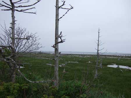 こんな感じで枯れたトドマツが見られます。 ホント、素敵な場所です。 嫁さんは「寂し過ぎる」と言うのですが、それがまた良いのではないかと私は思うのですがね。 私は何度来ても感動するだろうなぁ・・・・・・。 余談ですが、大学生の時は北海道道東の観光シーズンが一段楽する11月3日の夕方に来ました。 そのとき「もう客も来ないだろう」と丁度売店を閉めようとしていたおばちゃんが、 我々を自殺志願者だと思って「温かい飲み物を用意しておくから」と声を掛け、 私達がトドワラを見て帰ってくるまで売店を開けておいてくれたという心の温まる想い出があります。 (11月3日が過ぎると春まで売店も閉まってしまうので自殺されるとかなり困る) その売店も新しく造り替えられていてビックリしました。