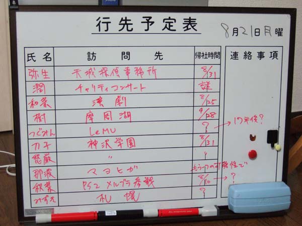 以前の会社での業務を引き継ぐ以上、業務に必要な物も一緒に引き継がなければいけない訳で、 PCとかプリンタとかその他周辺機器とか書類とか印刷用紙とか文房具とか、 最初の設備投資なんか会計ソフト買うくらいで済んでしまうほど色々なアイテムを貰ったのですが、 中にはドサクサに紛れて「持たされた」物なんかもあります。 その代表的なのが行き先予定を書き込むホワイトボード。 つか、一人で会社やってるのに書く必要無いだろう。 とは言え、使わないのはなんか勿体無いので 大勢の従業員を抱えて順風満帆の我が社を妄想してみることに。 ![]() スゲーよ!無意味にボーナス奮発しちゃいそうなメンバーだよ!! みんな外出中だけどな!! しかも帰ってきそうに無い連中ばっかりだ。 <BGM> Why did you go away(jun with TAHIRIH) [ beatmaniaIIDX13 DistorteD ORIGINAL SOUNDTRACK / KONAMI ] |