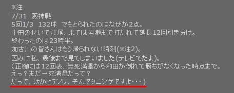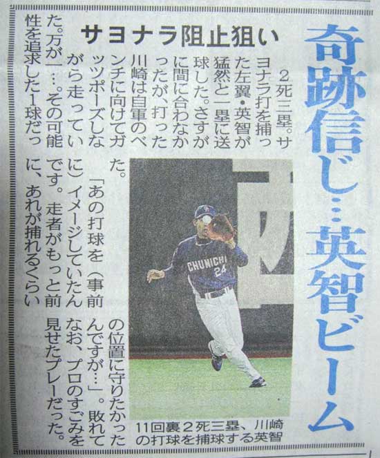 そう、今年のドラゴンズの快進撃は、 この最後まで諦めない英智の姿勢があったからなのです! 簡単に説明しますと、対ソフトバンク戦・11回裏の2アウトランナー3塁から 誰もがサヨナラゲームを確信した完璧なレフト前ヒットを打たれたのですが、 打ったバッターが1塁に着くまではゲームセットではないと、 英智は猛然とチャージをかけてレフトからファーストへ矢のような送球をしたのです。 安西先生の「諦めたら試合終了だよ」という言葉は超有名ですが、 まさにそれと同じ事を考えて英智もファーストへ投げたのだと思います。 結果として間に合わずにサヨナラゲームとなりドラゴンズは敗戦しました。 ただこのプレーでドラゴンズ選手の「英智の最後まで諦めない気持ちを見習おう!」という意識が強くなり、 そしてこのプレーでドラゴンズファンの「最後まで諦めないで応援しよう!」という意識が強くなり、 最終的に交流戦後の8ゲーム差を引っ繰り返すという 歴史的なリーグ優勝を成し遂げたのだと……断言できます! ※ホークスファンのtalk氏はこの試合観てた可能性高いと思いますが、 このプレーを観て、 「ドラゴンズの本当の脅威は英智の諦めない気持ちだ」とか、 「英智がいる限りドラゴンズは強い」とか 「英智のこの気持ちがやがてドラゴンズを優勝に導くだろう」とか 「今年の日本シリーズでホークスが注意しなければならないのは英智だ」とか 「英智、英智ってなんだ、諦めないことさ」とか 「英智、それは君が見た光」とか 様々なことが脳裏に去来したに違いありません。おそらく。多分。 ここまで読んで「単なるZac.の英智贔屓じゃねーか!」と思った人が100人中100人くらいいると思いますが、 ええ、大体それで合ってます。 ただ、私はこういう泥臭く熱い選手がスゲー好きです。 自分は投手経験者ですが、こういう選手が後ろを守っていたら本当に勇気付けられます。 ファンもこういう選手の気持ちに応え、最後まで諦めないで応援しなければいけません。 ドラゴンズの勝利を最後まで信じる姿勢で、 来年も精一杯声を枯らせながら応援していきたいと思います。 あ、決してこんなこと考えてはダメですよ!