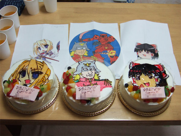3ヶ月前まで遡る話で恐縮ですが、 9月にうちの松田刑事と友人2人の誕生会をやりました。 いや、9月12日生まれの松田刑事と同じ 9月生まれの友人が私の周りには多いもので、 久しぶりにみんな集まってパーッとお祝いしようかと。 んで、誕生日と言えばケーキです。 個人的に結構美味しいと思うケーキ屋がうちの近所にあるんですけど、 最近(と言っても2,3年前くらいから)有料ですが誕生日ケーキに絵を描いてくれるサービスを始めまして、 「ああ、これはなかなか面白そうだぞ」と思い至りどうすればいいか直接聞きに行ったところ、 「見本があれば何でも書けるよ」という答えが。 これは、やってみるしかない!! と言う訳で、9月に誕生日を迎える3人の好きなものを描いて貰いました。 ![]() 左から…… ・最近『プリンセスラバー!』にハマっていた友人に『シルヴィア』 ・『ガンダム』を愛し、『ガンダムのパチ物』も愛する友人に『シャアもどき』 ・人形を渡すと食べたり投げたりするうちの松田刑事には『ゆっくりの赤いやつ』 となっております。 なかなか再現度が高くてビックリしました。特に『シャアもどき』が。 「後ろ髪の跳ね具合」とか「ケツ顎」とか「口元の歪み具合」とか「ヘルメットのジオン軍もどきマーク」とか 細かい部分にも手を抜かない完璧な仕事っぷりにパティシエの底力を見た気がします。 奴等、本気(マジ)になって作成したぞ、と。 ちなみに絵を描く値段ですが、材料費込みでそれぞれ900円でした。 絵を描ける大きめのケーキを買わなければならないのでそれなりに値が張りますが、 誕生日の素敵な思い出と引き替えだと考えれば安いものです。 えっ?シャアもどきがどういう思い出かって?? そりゃ腹筋痛くなるくらいみんなで笑ったのが思い出ですよ。 みなさんの近くにあるケーキ屋でも絵を描くサービスやってましたら、 是非ともお祝いする人の好きな絵を描いて貰ってくださいな。 個人的にオススメです。 <BGM> Elisha(DJ YOSHITAKA) [ beatmaniaIIDX 17 SIRIUS 楽曲 ] |